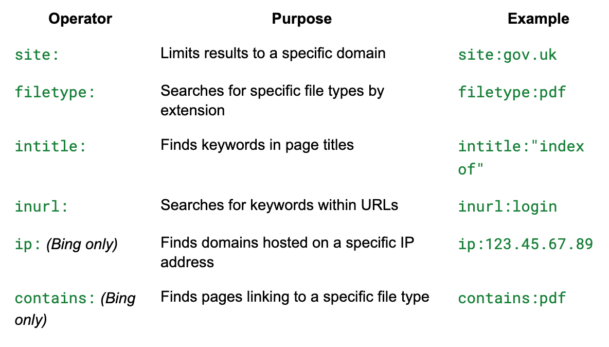 Before diving into advanced dorking, you need to master the basic operators - the building blocks of all OSINT search queries. These are some basic examples: